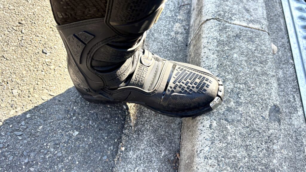 初めて履いたら『なんじゃコラァ〜』になります。はい。ガチガチに固めた足首は歩くこともままならず、バイクに跨るのも大変、さらにチェンジペダルの下に爪先も入りません。