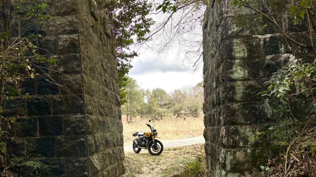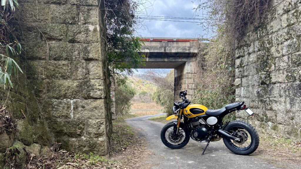 写真の奥の橋台は、現在も使われているJR大和路線の橋です。タイミングが良ければ電車が通過するところが見えますよ。
