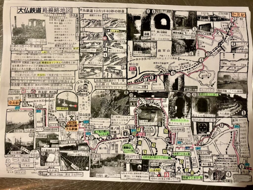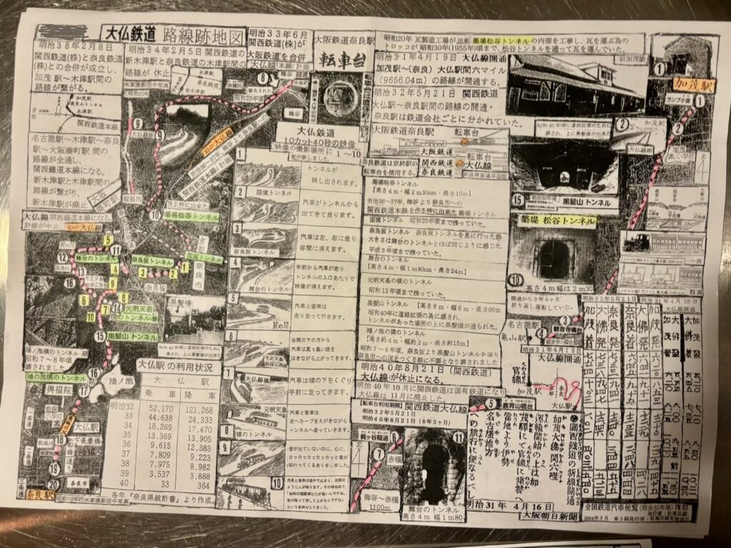 『はい、そうです』と返事をすると『良かったらこれをどうぞ。』と下の写真の地図と資料をいただきました。お話を聞くと地元で大仏鉄道の調査をされている方だそうで、膨大な資料とその細かさにびっくりしました。