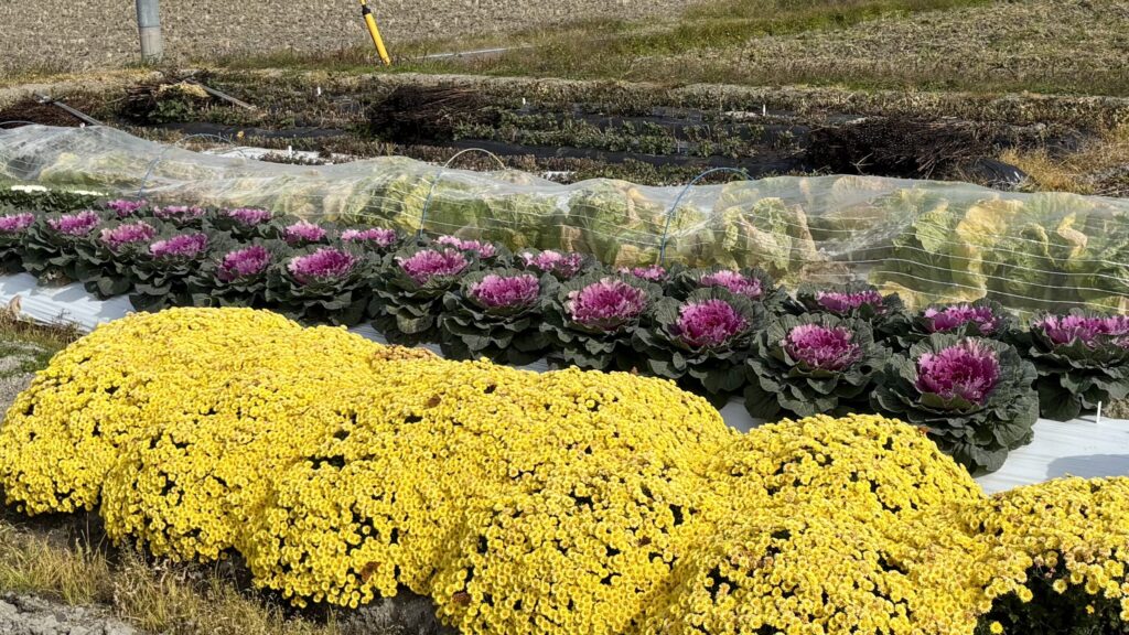 途中のコンビニで休憩して、「うーん秋やねぇ」とか言ってふと横の畑を見るともう葉牡丹が咲いてるし💦もうお正月の準備なんですね。