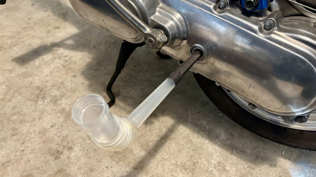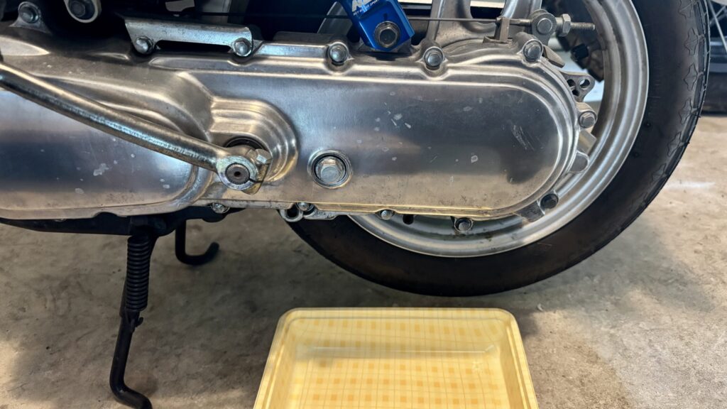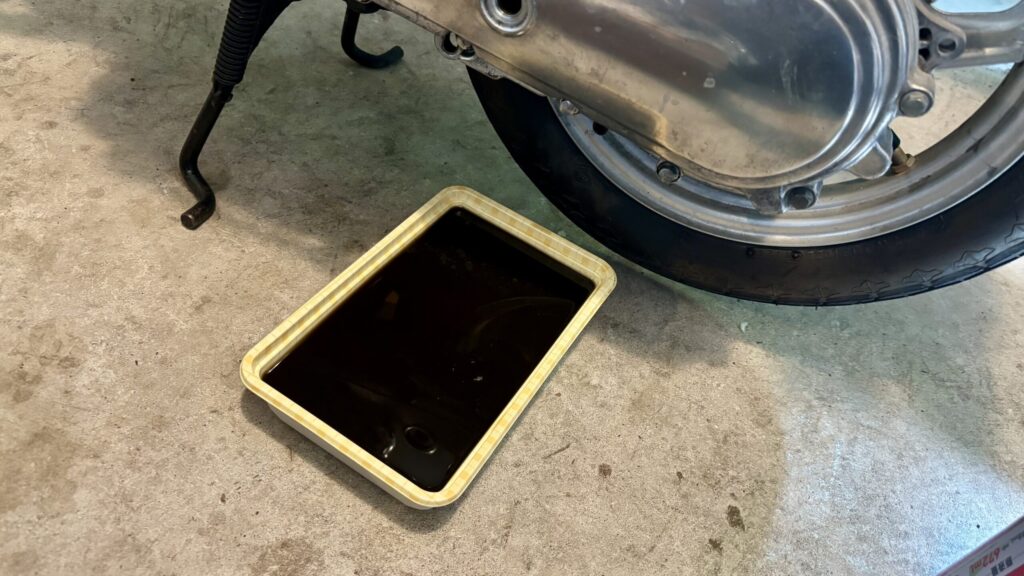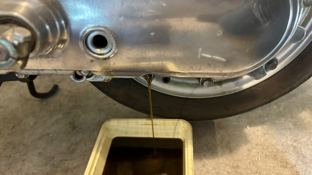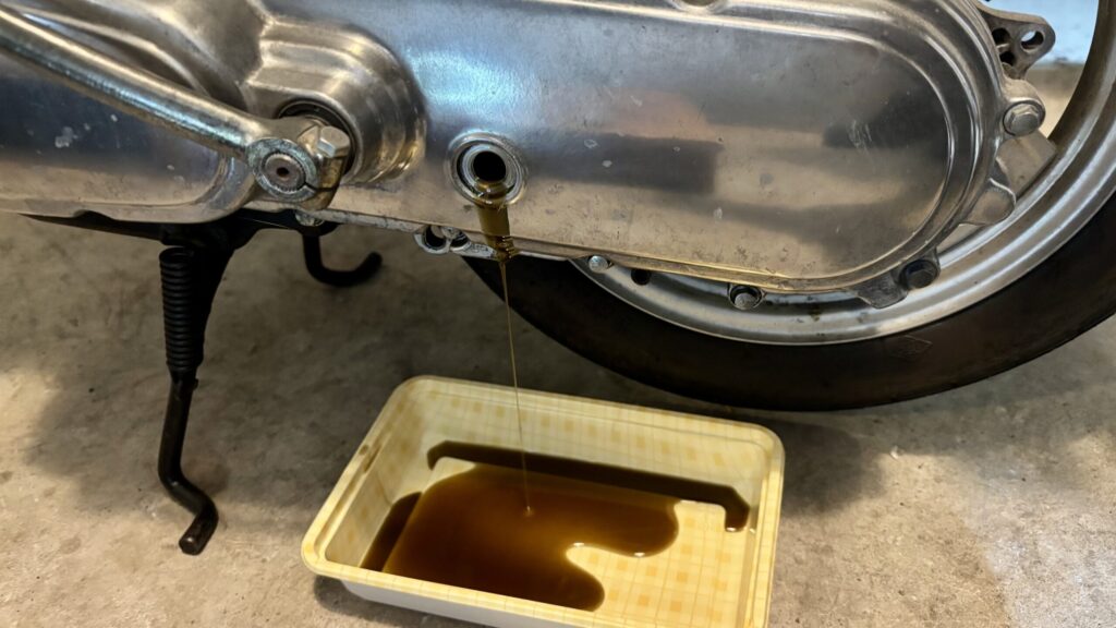 ボルトを外すとギアオイルがドボドボと抜けてきましたね。できるだけギアオイルを抜いてしまいたいので車体を傾けたりしながらギアオイルを抜きます。こんな時ハミングは軽くていいですね。