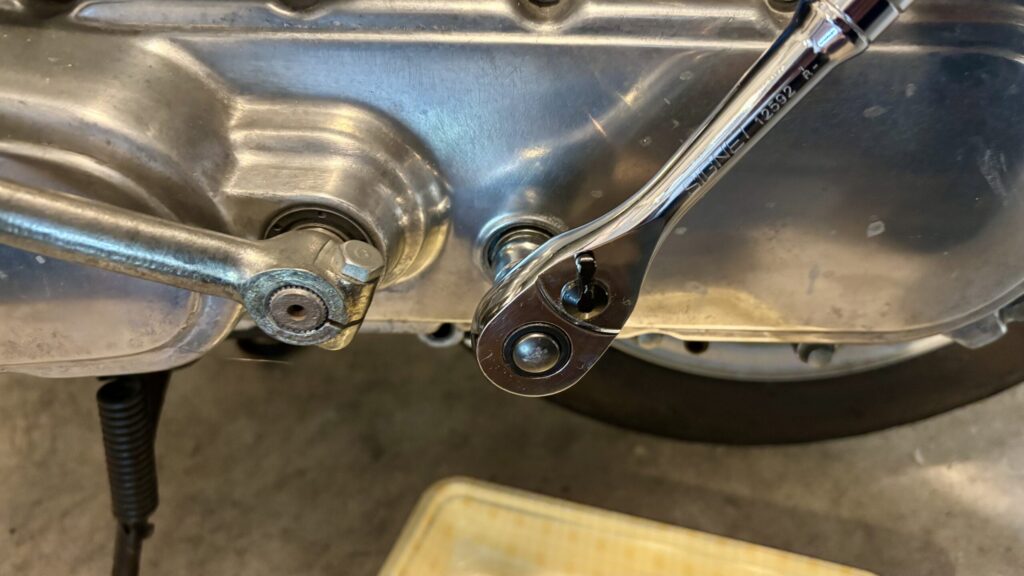 次にクランクケースカバーのフランジボルトを8ミリのソケットで外します。