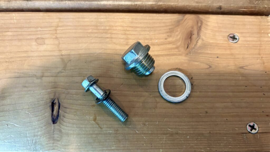 外したシーリングボルト、フランジボルトには両方ともガスケットが付いています。(ホンダのパーツリストではワツシャーと表記されています。)もしガスケットが見当たらない時はクランクケースに張り付いているか、オイルと一緒にトレーに落としたかなので必ず探してください。