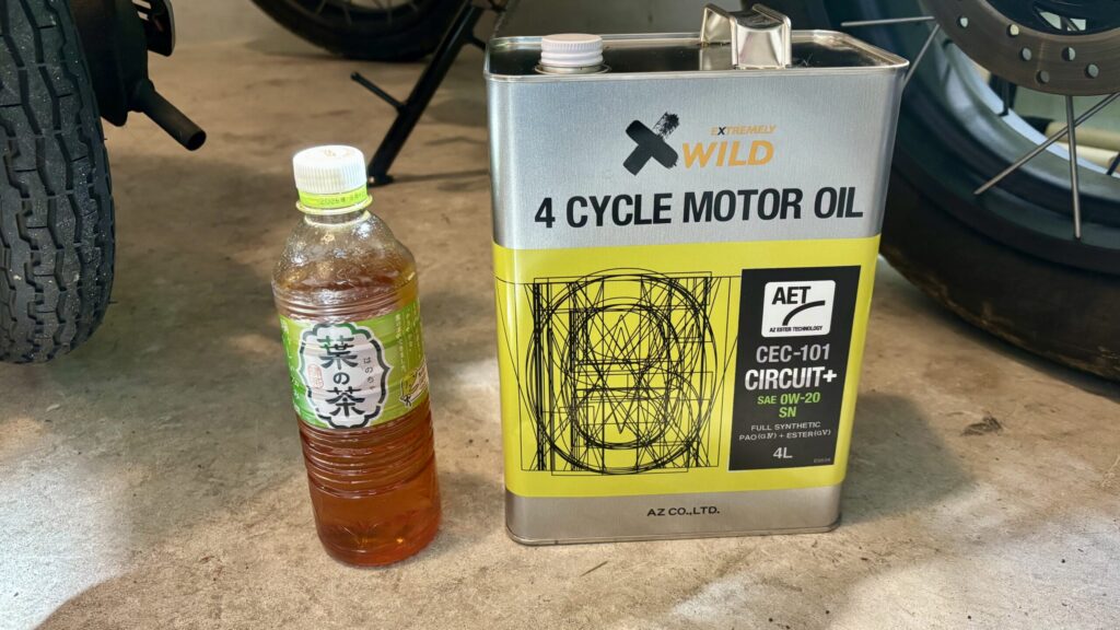 オイル缶の横のペットボトルはオイルの量を測るためにオイルを入れた状態です。