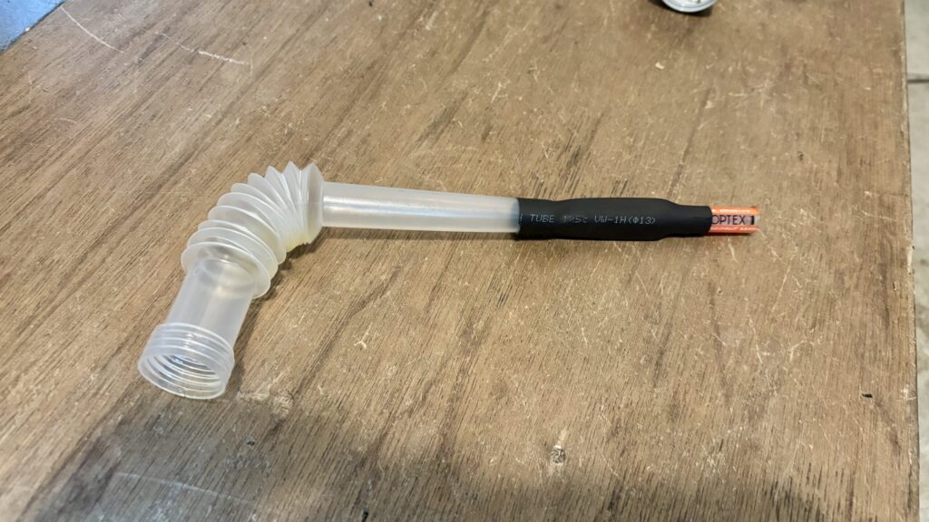 手持ちに小さなノズルもなかったのでちょっと知恵を絞って考える。そうだぁ、蛍光ペンの軸を切って収縮チューブでノズルと合体だぁ!